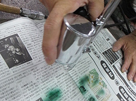 8.同じ染料を入れ噴射します。これで、おもだかの葉が染め上げると、立体的になるのです。 変化したのがおわかりでしょうか。 |